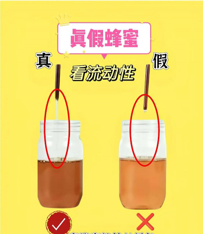 - 真蜂蜜流动性强,滴管或筷子提起后能拉丝且断丝后回缩。 - 假蜂蜜流动性差,可能出现颗粒感或沙粒感。