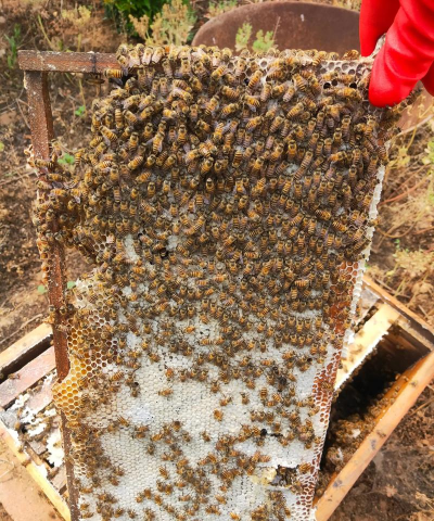 使用烟熏器驱离蜜蜂后,将老旧或雄蜂脾割除,保留子脾并绑于巢框。