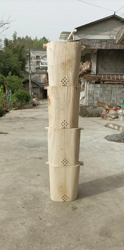 # 4. 现代化空心式蜂桶弧度加工:用木工工具将木板加工成弧形,侧面打孔插入销钉固定。