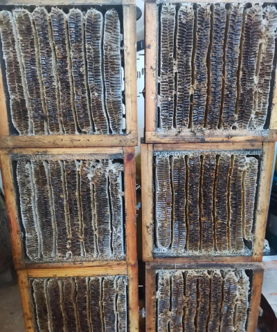 - 通过蜂箱缝隙或翻桶时,用割蜜刀沿蜂路轻割蜜脾,尽量保留未封盖的蜜脾(含未发酵的蜂蜜)。