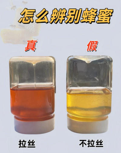 真蜂蜜流动性较好,拉丝测试时粘度高但无拉丝现象(结晶后更明显);假蜂蜜可能过于浓稠,拉丝效果差。