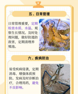 - 定期消毒池塘和虾体,监测生长异常及时处理。可使用抗生素或生物制剂预防疾病。