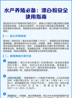 - 清塘消毒:带水清塘时每亩水深12-15kg,干塘消毒每立方米水体20-30g。 - 病害防治:每立方米水体1g,连续泼洒2天,高温季节每立方米不超过1.5g。 - 施药后需充分溶解或过滤,避免残留。