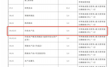 四、其他相关标准水产加工企业标准: 需执行《食品安全国家标准食品添加剂使用标准》(GB 2760-2014),冷冻水产品及鱼糜制品中磷酸盐限量同样为 ≤5.0g/kg