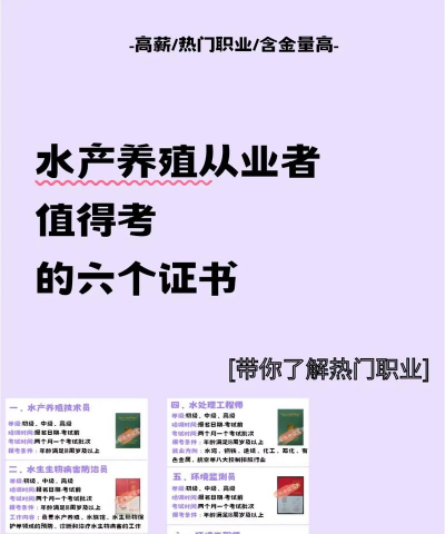 :针对参与新技术、新品种研发的专业人员。水生生物病害防治员证/水生动物防疫检疫员证:分别适用于病害防治和防疫检疫工作。