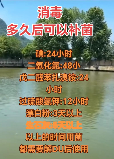 水产养殖中解毒后补菌的时间安排需根据具体场景和使用的消毒剂类型综合判断,以下是关键要点总结: