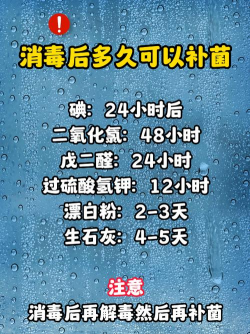 开始补菌,此时消毒剂残留已大部分降解,有利于有益菌的存活和繁殖。- 特殊情况:若使用高浓度消毒剂(如过硫酸氢钾),需等待更长时间(如6小时)以确保残留降低到安全水平。