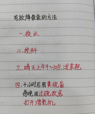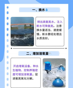 - 每天中午换水1/3,炎热天气需增加至1/2,同时开启增氧机1-2小时,促进底部溶氧,加速氨氮转化为硝酸盐。