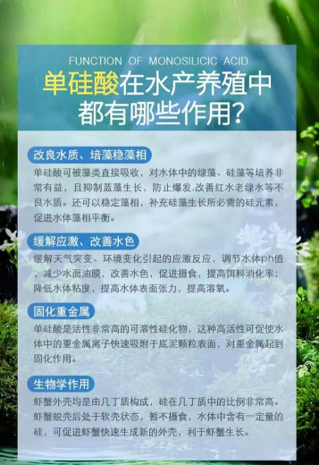 单硅酸在水产养殖中具有多重作用,综合多个权威资料可归纳为以下核心功能: