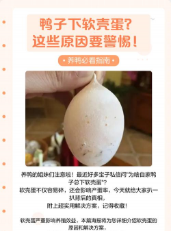 鸭子下软壳蛋是一种常见的问题,可能由多种因素引起,如营养不均衡、疾病、应激、年龄或遗传等。改善鸭子下软壳蛋需要从以下几个方面入手:
