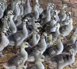 朗德鹅的雏鸟(小鹅)在出生后几周内,身体较小,羽毛稀疏,颜色也较浅,尤其是刚出生时全身覆盖着灰白色的绒毛。