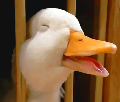 “嘎嘎嘎!哈哈哈!” —— 一只鸭子一边摇摆着身子,一边张开嘴巴大笑,眼睛眯成一条线,脖子伸得老长,仿佛被什么特别好笑的事情逗乐了。它的翅膀可能还一抖一抖的,像是在笑得控制不住自己。