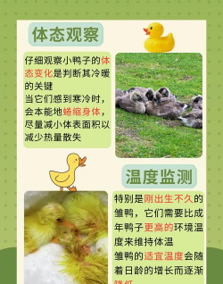 雏鸭:非常怕冷,尤其是出生后的前几周,必须用保温灯或加热设备维持温度在25~30℃之间。