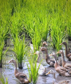 日本种植水稻田里放鸭子