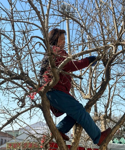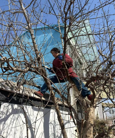 先锋里社区居民甘大爷主动承担小区树枝修剪工作,解决居民采光问题,属于社区热心居民的自愿行为。