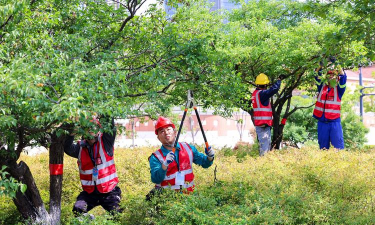 西湖社区、大龙社区等组织居民或专业团队开展小区枝干修剪活动,旨在提升居住环境与安全。