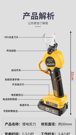 功率:高功率电机可快速剪断粗枝,部分型号采用无刷技术,响应更迅速。 - 刀头设计:锋利精准,刀头调节灵活(3.0-4.0公分开口),避免损伤树体。- 便携性:轻量化设计,手柄符合人体工学,长时间使用不易疲劳。