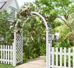 - 金属拱门是理想选择,可搭配玫瑰、铁线莲等藤蔓植物,网格设计便于植物攀爬。 - 横向条状木拱门造型时尚,适合开阔空间,需注意比例协调。