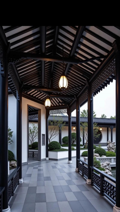 - 门庭: 采用简约混凝土或砖混结构,保留传统轮廓,搭配镂空花窗或玻璃元素。 - 回廊