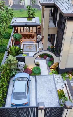 需同时满足车辆停放、家庭使用及景观协调需求,采用传统与现代相结合的设计风格。