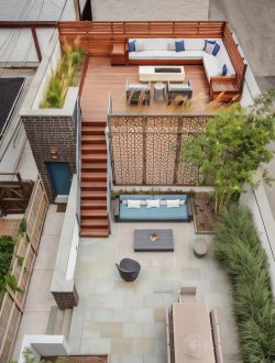 通过种植高大的绿植、设置屏风或遮阳棚,平衡开放性与私密性。楼梯和出入口需设置防护栏,确保使用安全。