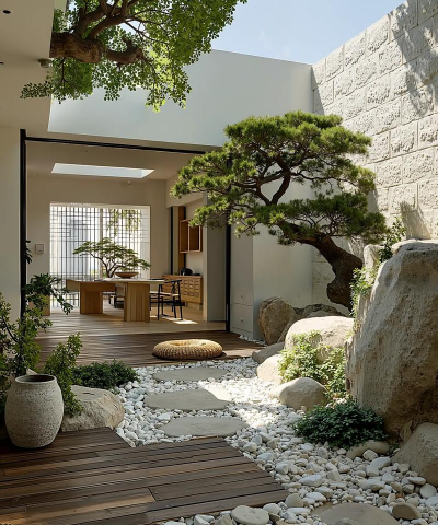 针对有大树的庭院设计,可结合以下策略实现美观与实用性的平衡:地面硬化与抬升 -...