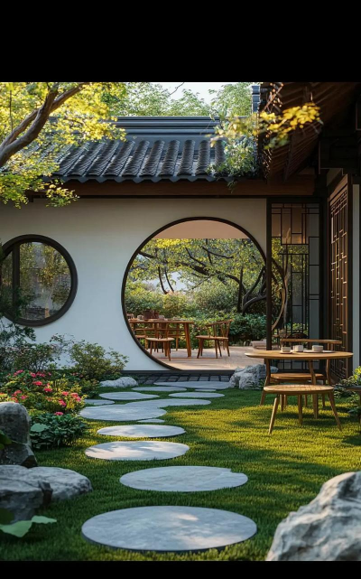 园墙、门窗、铺装材质需与整体建筑风格统一,如中式庭院强调对称与意境。