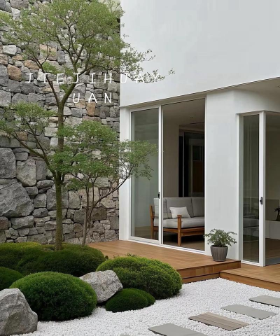 借鉴日本枯山水、中国假山等传统元素,表达"返璞归真"的意境。例如,通过白沙、石组的组合,营造空灵静谧的空间氛围。