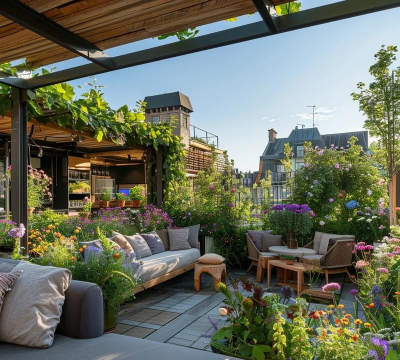 选择抗旱、抗风植物,如多肉植物、灌木或藤本,搭配四季花卉。可设置垂直花园或屋顶绿化带。