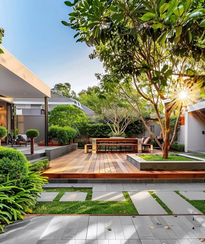 针对有大树的庭院设计,可结合以下策略实现美观与实用性的平衡:地面硬化与抬升 -...