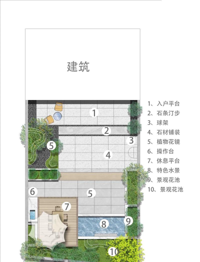 - 水体:设置池塘、溪流等元素,增强景观的动态感与生命力。