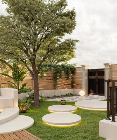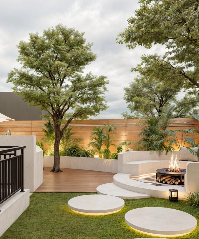:设置亭台、回廊,采用三角、五角等几何造型,搭配落地灯、镜面反射增强氛围。 三、材质与色彩材质选择:以天然石材(花岗岩、青砖)、木材(防腐木、铁艺)为主,搭配玻璃、金属材质提升质感;