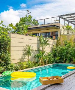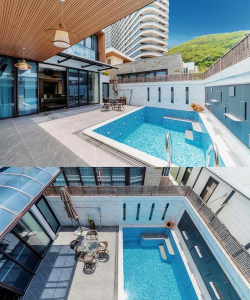 避免将泳池设置在顶层阳台的正前方,防止阳光直射形成眩光,同时保护隐私。若空间允许,可考虑在顶层设置步入式泳池或玻璃房泳池,减少对居住空间的干扰。