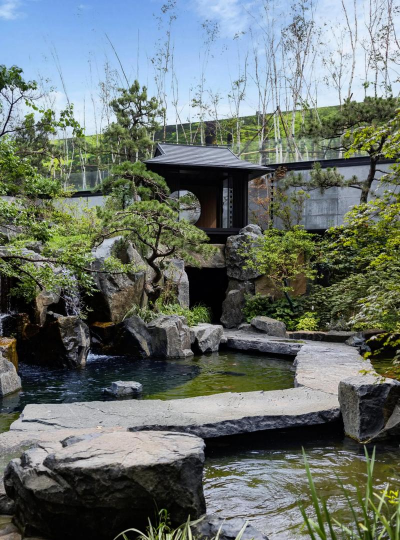 - 采用千层石、鹅卵石铺底,搭配流水、假山等元素营造山水意境。