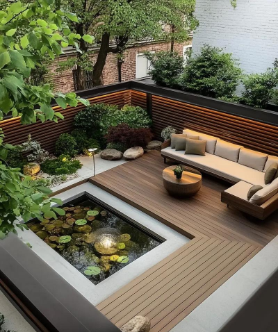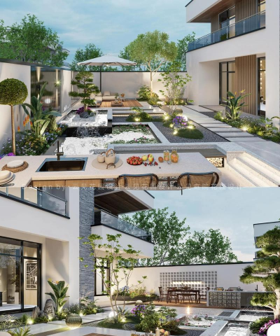 :以水景(如喷泉、鱼池)为核心,搭配花境花园和休闲区。- 私密区:通过曲折小径、绿篱或半通透墙体划分。