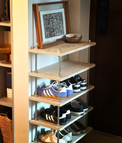 吊鞋架设计使用绳子或织带来制作吊鞋架,通过在墙壁上钉几个钩子,将绳子或织带穿过鞋子的后跟,用钩子挂在墙上。这种设计不仅节约空间,还可以将鞋子作为装饰品展示。