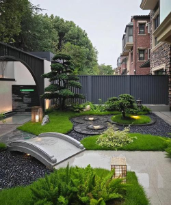 二、日式风格禅宗思想体现: 追求极简与自然纯净,以白沙、苔藓、流水为核心元素。常使用不对称布局,搭配修剪松柏和苔藓,营造静谧空灵的庭园空间。