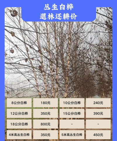 米径4公分,高度500公分的白桦树苗:价格为80元一棵。