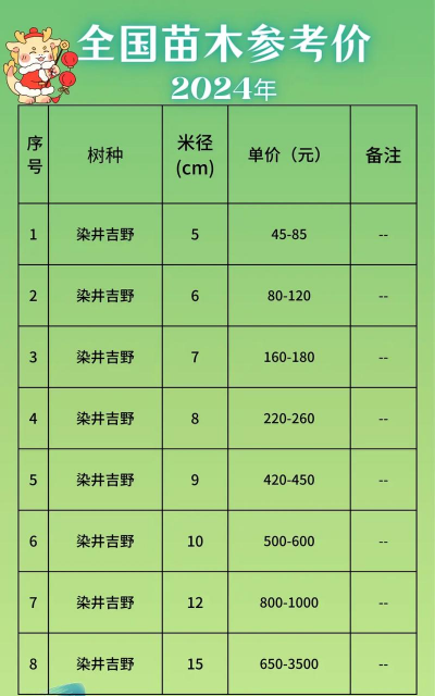 绿化苗木的价格因品种、尺寸、季节、市场需求等因素而异。以下是一些常见绿化苗木的大致价格范围(仅供参考):