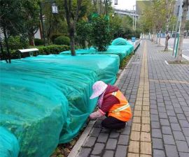 针对常绿植物防寒风障要求应搭设在迎风一侧和与其相临的两侧的在迎风面方向,大小适合,高度超出植株高度0.5-1.0米,与植株水平距离保持0.5米的距离。