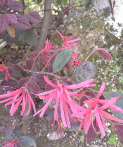 红花檵木:叶革质互生,叶片常年为暗红色,但光照不足时叶片容易发绿。红花檵木为常见园林品种。