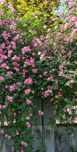 粉团蔷薇是一种多头开花的攀援灌木,花多朵排成圆锥状花序,花直径约1.5-2厘米,花瓣宽倒卵形,先端微凹,基部楔形。