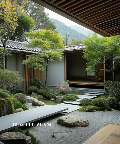 结合传统元素与现代简约风格,例如玻璃门窗与天然石材的对比,强化禅意氛围。