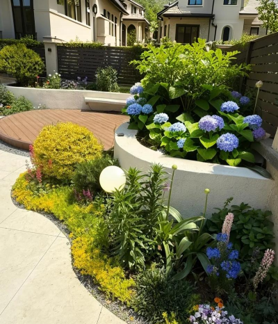 用冬青、黄杨等植物打造圆形、方形绿篱,既划分空间又增强艺术感。